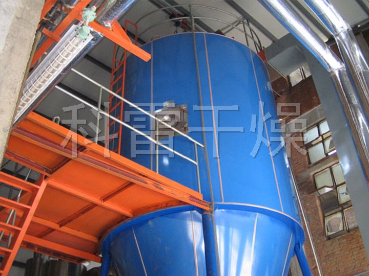 空氣經(jīng)過濾和加熱,進(jìn)入干燥器頂部空氣分配器,熱空氣呈螺旋狀均勻地進(jìn)入干燥室。料液經(jīng)塔體頂部的高速離心霧化器,(旋轉(zhuǎn))噴霧成極細(xì)微的霧狀液珠,與熱空氣并流接觸在極短的時(shí)間內(nèi)可干燥為成品。成品連續(xù)地由干燥塔底部和旋風(fēng)分離器中輸出,廢氣由風(fēng)機(jī)排空。