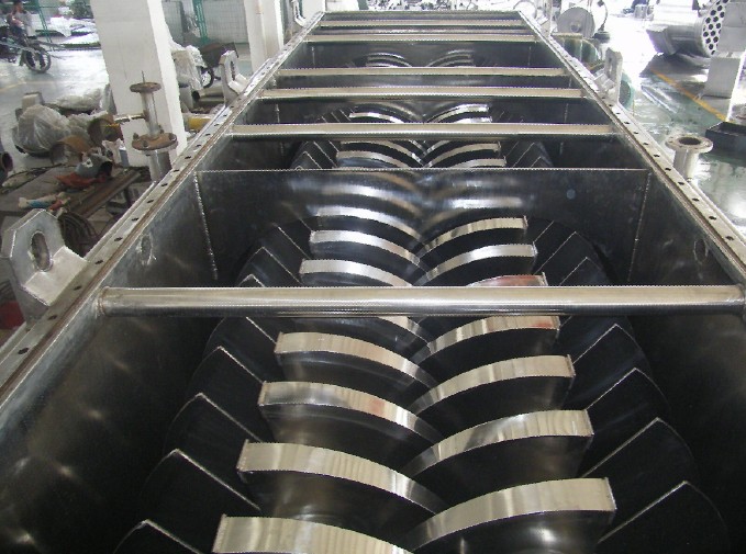 空心軸上密集排列著楔型中空漿葉,熱介質(zhì)經(jīng)空心軸流經(jīng)漿葉。單位有效容積內(nèi)傳熱面積很大,熱介質(zhì)溫度從-40℃到320℃,可以是水蒸汽,也可以是液體型:如熱水、導熱油等。間接傳導加熱,沒有攜帶空氣帶走熱量,熱量均用來加熱物料。熱量損失僅為通過器體保溫層向環(huán)境的散熱。楔型漿葉傳熱面具有自清潔功能。物料顆粒與楔型面的相對運動產(chǎn)生洗刷作用,能夠洗刷掉楔型面上附著物料,使運轉(zhuǎn)中一直保持著清潔的傳熱面。漿葉干燥機的殼體為Ω型,殼體內(nèi)一般安排二到四根空心攪拌軸。殼體有密封端蓋與上蓋,防止物料粉塵外泄而充分發(fā)揮作用。